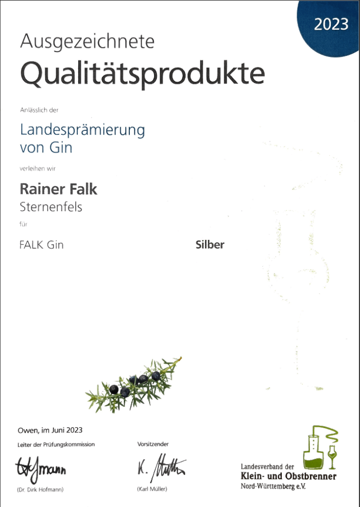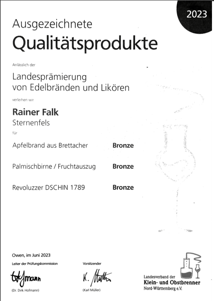 Zudem wurde unser Brennereibetrieb in der Kategorie, Brände und Geiste (ungezuckert) mit 19,29 von 20 möglichen Punkten mit dem 2. Platz in der Landeswertung ausgezeichnet.